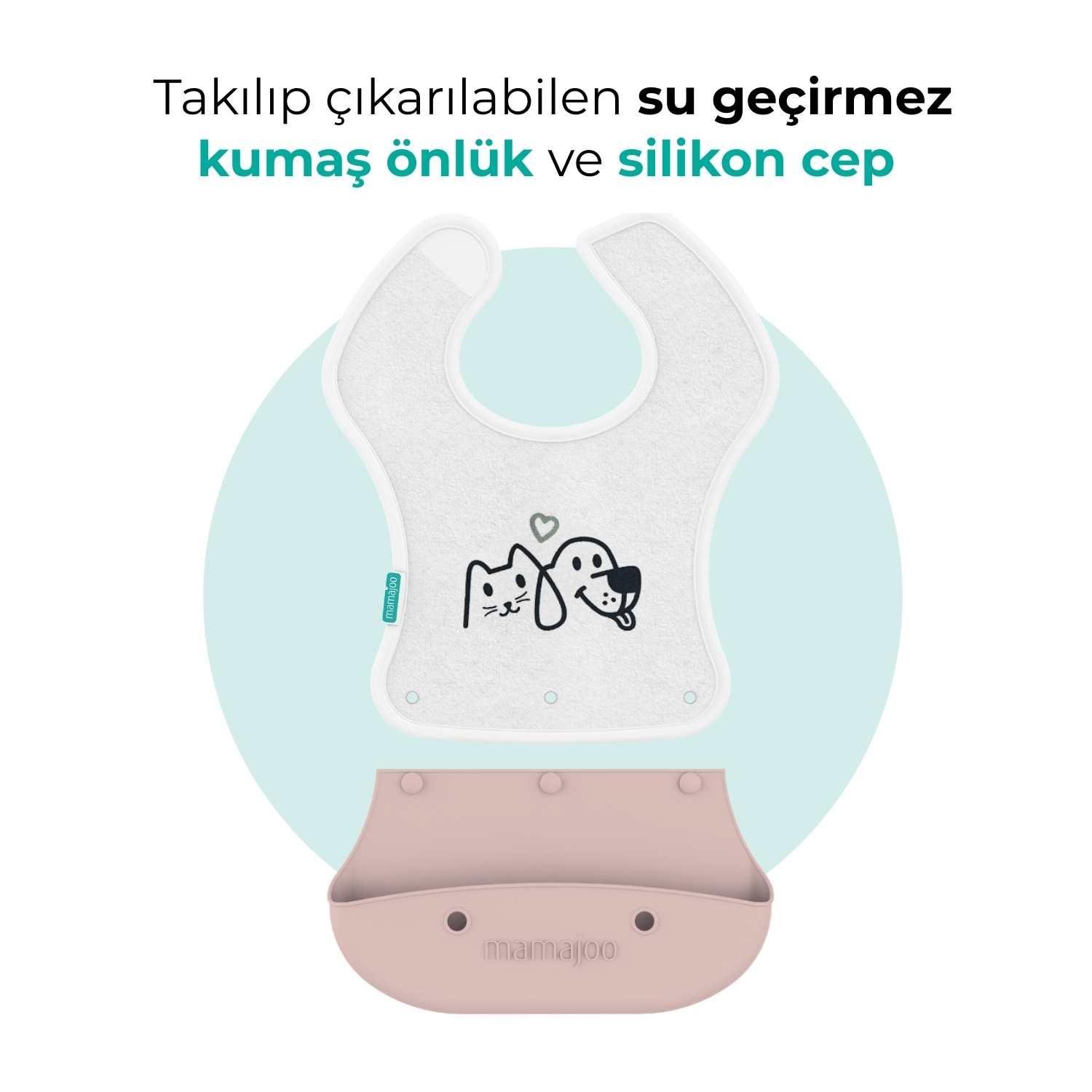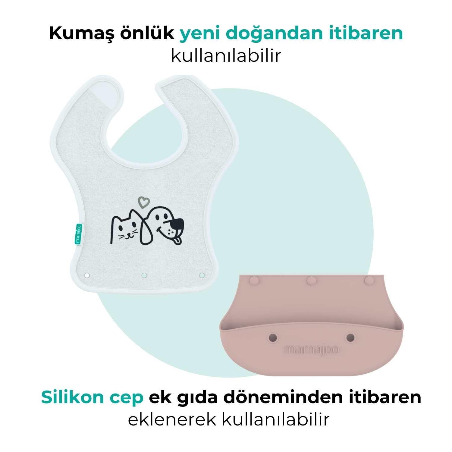 Mamajoo 2-in-1 Katlanır Mama Önlüğü, bebeğinizin yenidoğan döneminden itibaren büyüme sürecindeki farklı önlük ihtiyaçlarınızı tek bir ürünle karşılar. BPA ve Fitalat içermeyen gıdaya uygun silikon ve kumaştan üretilmiştir.